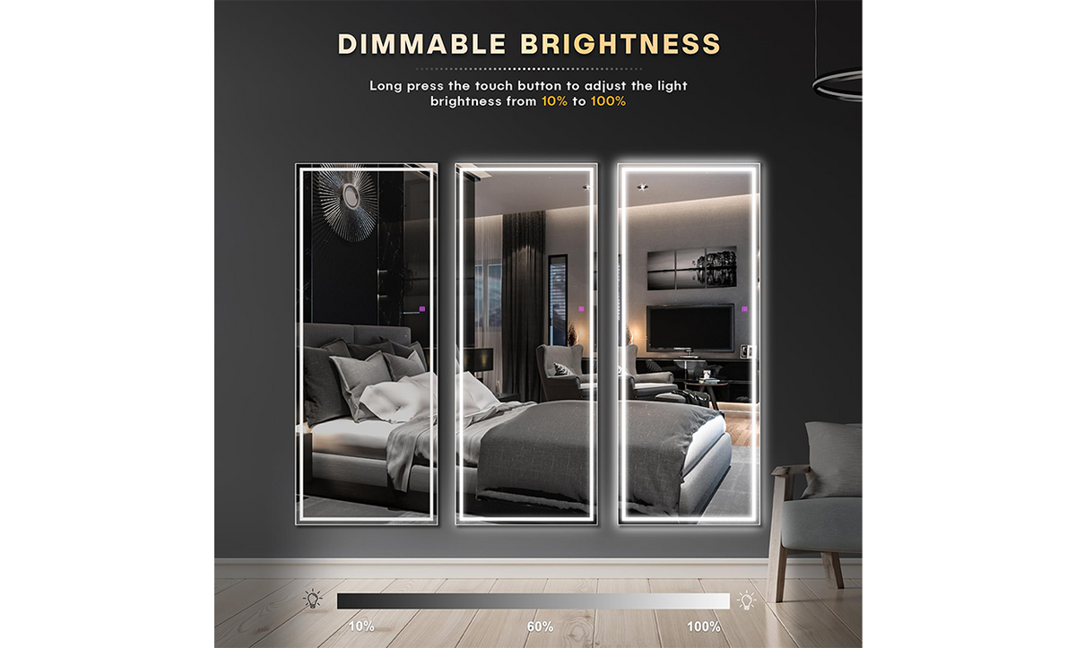 【3 Color & Adjust Brightness】The brightness and light temperature of this full length mirror are controlled by a smart touch button. Short press the switch to change the color temperature into white light, warm light or yellow light. Long press the switch for seconds to adjust the brightness to your liking.
